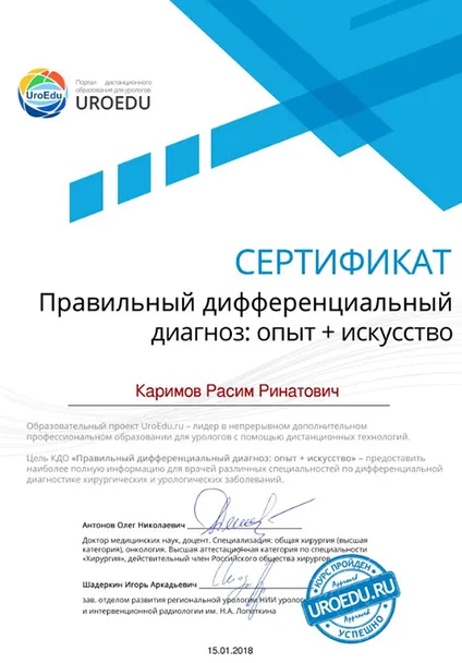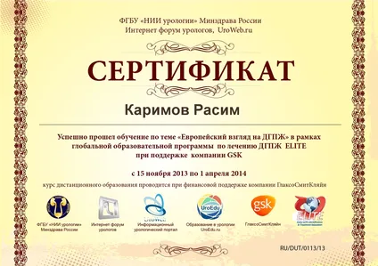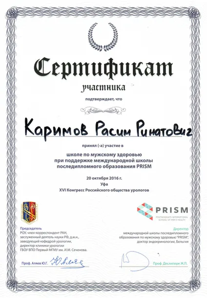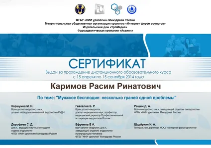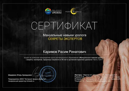 - Повышение квалификации по программе «Андрология и хирургическое лечение органических сексуальных расстройств»