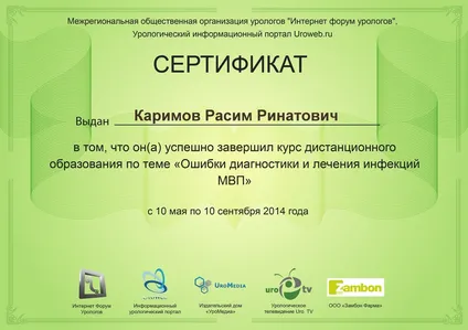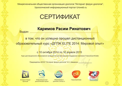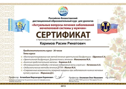 - Курс повышения квалификации по программе: «Актуальные вопросы лечения заболеваний мочеполовой системы у мужчин»